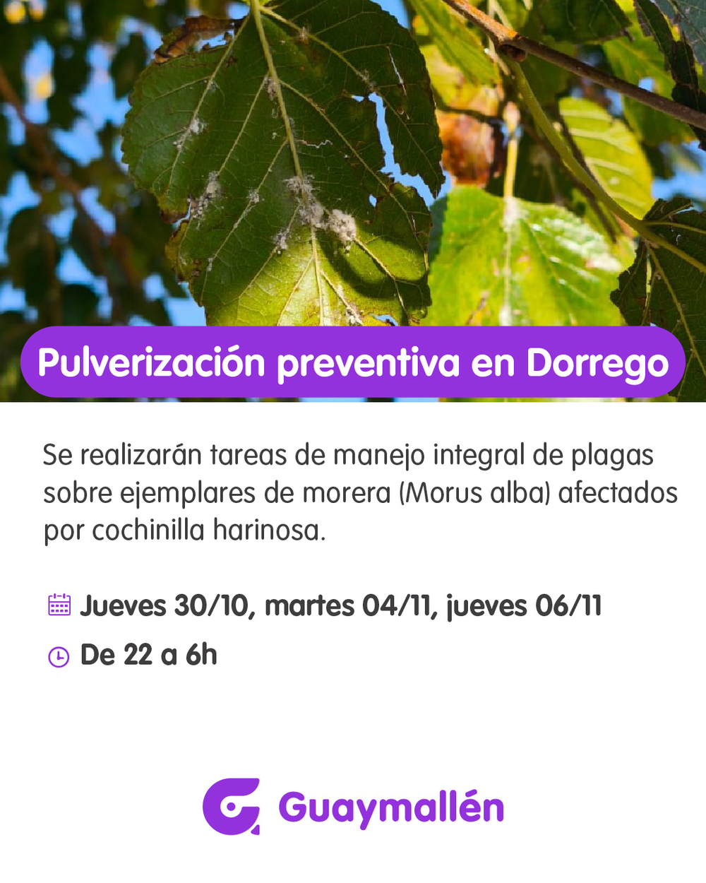 La Municipalidad de Guaymallén comenzará un operativo de pulverización de moreras para combatir la presencia de cochinilla harinosa, una plaga que afecta a estos árboles y genera deterioro en su follaje. Las tareas estarán a cargo de la Subdirección de Espacios Verdes.